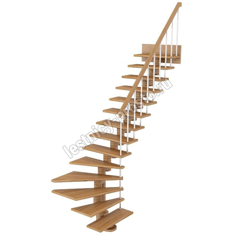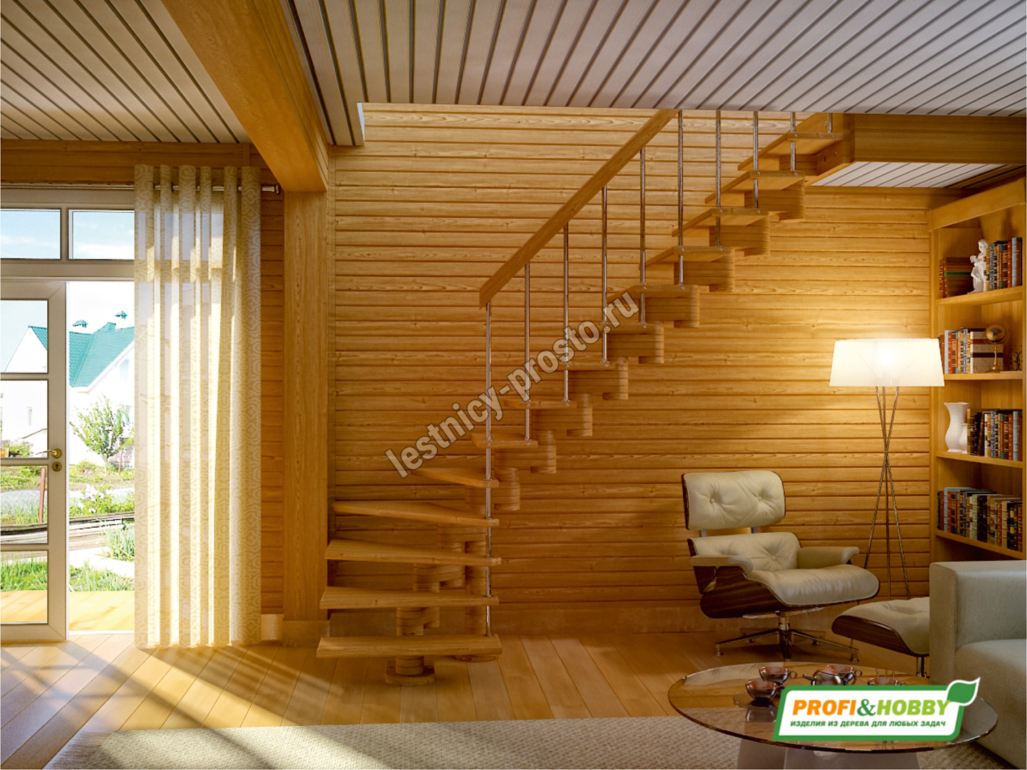 Современная лестница с "воздушным" дизайном. Смотрится легко и благородно, благодаря конструкции на больцах. Хороша при установке к стене, компактна.