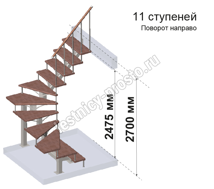 Комплект ограждений для П-образной лестницы PROSTO MONO из 11 ступеней.