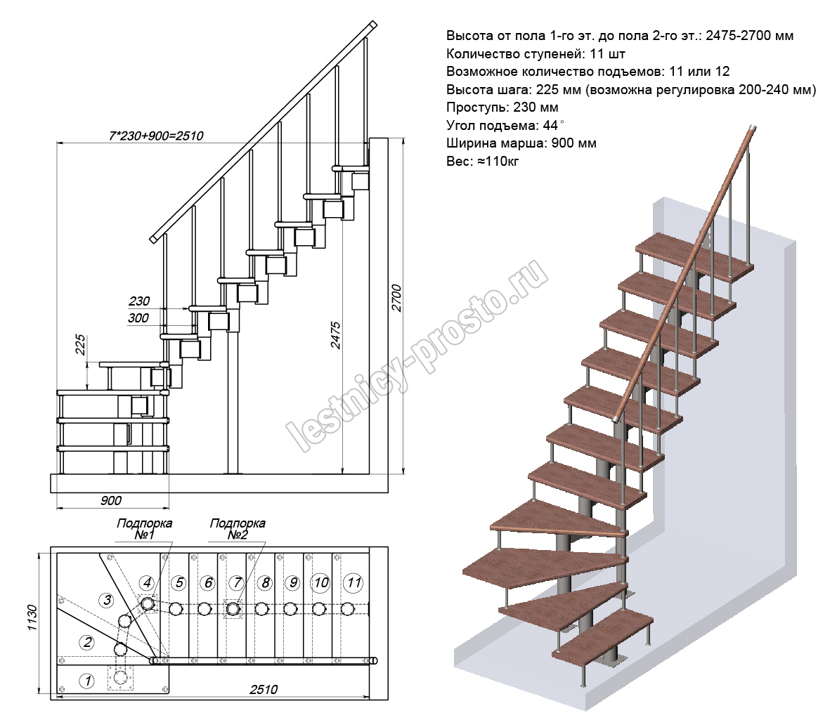 Высота лестницы 2475 - 2700 (11 ступеней) мм