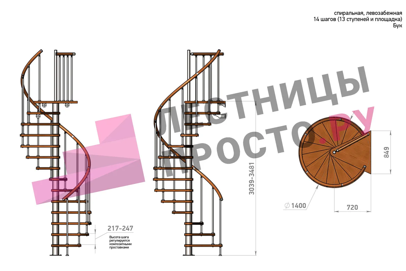 Винтовая лестница Prosto Spiral Black D140см, h303.9-348,1 см, бук