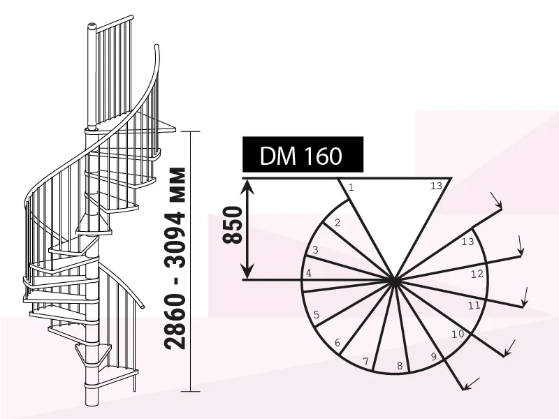 Благодаря возможности регулировать высоту шага с помощью пластиковых вставок (входят в базовый комплект), высоту лестницы можно варьировать в пределах от 2860 до 3090 мм.
